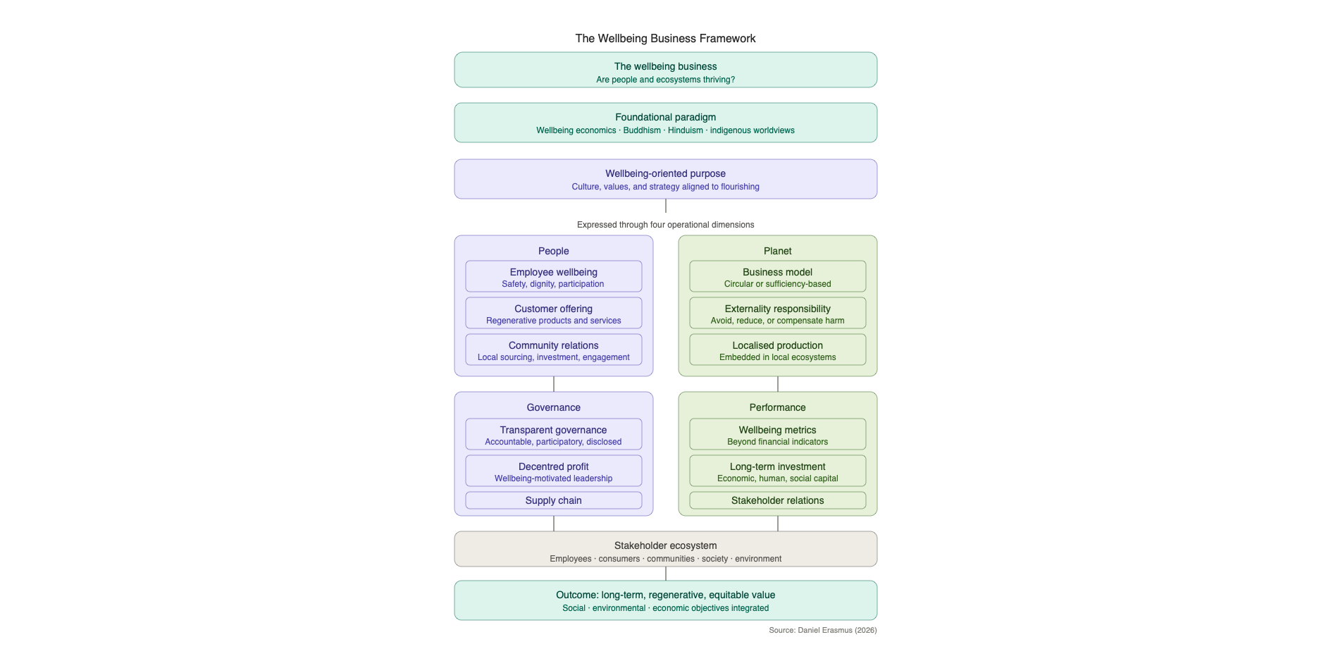 The conventional business model externalises harm — to workers, communities, and the environment — in pursuit of shareholder value. A wellbeing business internalises responsibility instead. It asks whether its supply chains are non-extractive, whether its communities are better off, and whether the ecosystems it depends on are being regenerated.